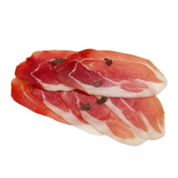 Prosciutto al Tartufo - нежнейший вяленый окорок (пармская ветчина) с добавлением в качестве акцента летнего чёрного трюфеля (tuber aestivum Vitt). Соединив два деликатеса в один итальянские мастера не перестают удивлять и предлагают нам продукт с ещё более оригинальным вкусом в новом изысканном стиле.