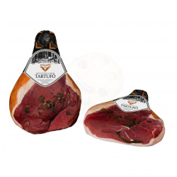 Prosciutto al Tartufo - гастрономическое совершенство из отборной свиной ножки с начинкой из хлопьев летнего трюфеля (tuber aestivum Vitt). Идеальные ножки, соединенные с трюфелем и белой морской солью…. это как суша встречается с морем, создавая одно из самых невероятных чудес, которое нам дано ценить, а климатические условия и каждый этап производства позволяют создать великолепные шедевры вкуса, которыми можно наслаждаться. Сладкий вкус ветчины дополняется пьянящим ароматом трюфеля, в результате чего получается уникальный и изысканный вкус драгоценного продукта. Это настоящая Прошуттомания!